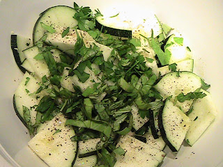 Cut the zucchini into 1/2 inch slices across the middle, then cut the rounds into four pieces. In a large bowl, season the zucchini with a little olive oil, salt and pepper. Mix thoroughly.