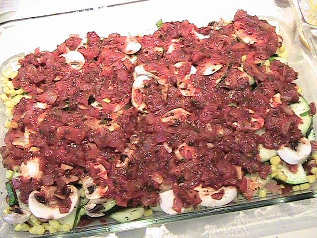 Next layer the corn over the zucchini.