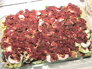 Now spoon the remaining tomato sauce mixture over everything. Notice the sauce is thick and not watery. The vegetables will release quite a bit of liquid during the cooking process and so you want the tomato sauce to be on the dry side.