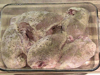 Coat chicken with olive oil. Sprinkle salt, pepper, garlic powder, sage, thyme, marjoram on all exposed areas of chicken.