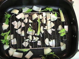 Distribute onion and celery on bottom of roasting pan. Add bay leaf to water. (Discard the onion, celery and bay leaf after baking)