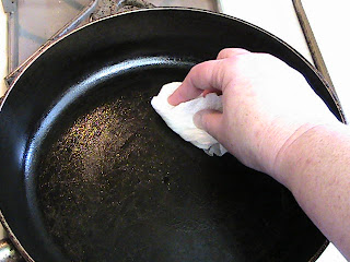 Using a small amount of oil and a wadded up paper towel, quickly spread the oil over the surface of the pan. You will do this before cooking each batch of pancakes.