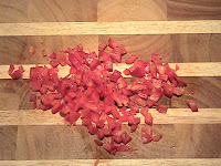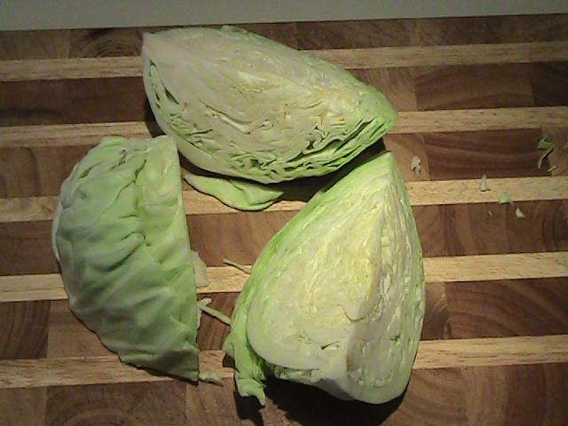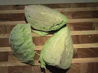 Cut the cabbage into wedges. Cut the wedges into slices. Cut the slices into bite-size pieces.