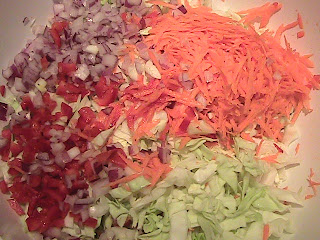 Use different types of cabbage. Omit carrots, bell pepper and onions. Use chopped green onion. Add chopped jicama, radishes, celery or crisp apples. Anything your imagination and taste allows is OK.