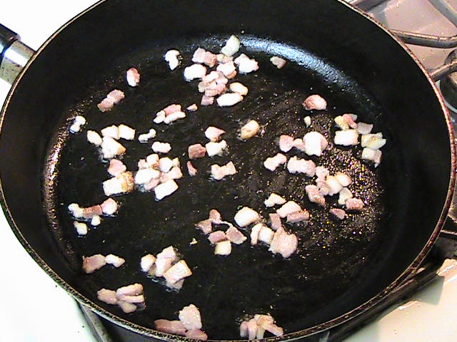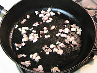 Chop the bacon into ¼ inch pieces, sauté over medium low heat until the fat is rendered.
