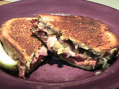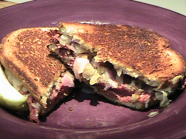 Heat the sauerkraut in a pan and keep warm until ready to add to sandwich. Chop the onion and saute in a little oil or butter until soft, not brown. Set onions aside.