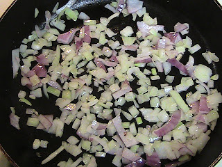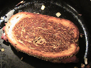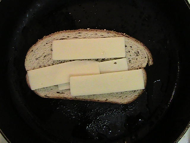 Heat your skillet to medium. Place the bread buttered-side down in the pan. Put some of the sauteed onions on this slice of bread.