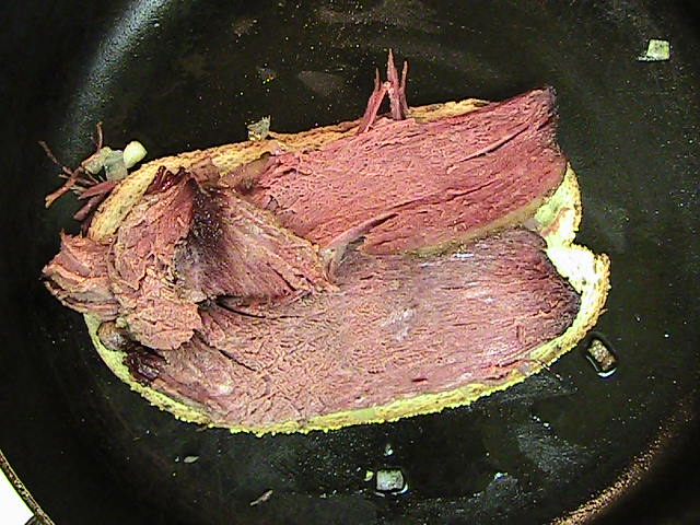 Slice the cooked corned beef as thin as possible. Slice the Swiss cheese. Lightly butter one side of each slice of bread. (no one said this was a low cal meal!)