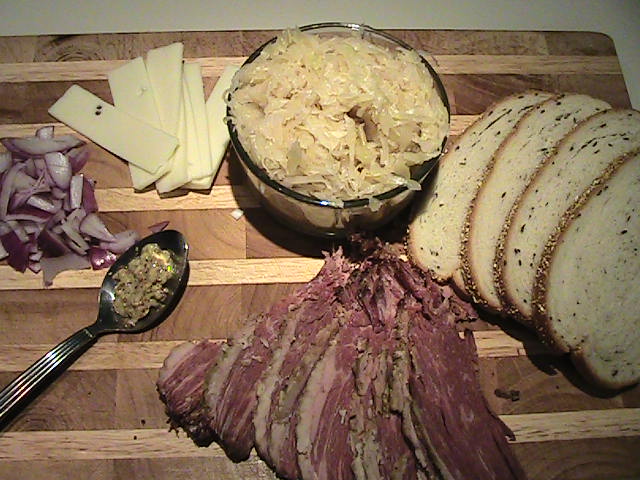 Heat the sauerkraut in a pan and keep warm until ready to add to sandwich. Chop the onion and saute in a little oil or butter until soft, not brown. Set onions aside.