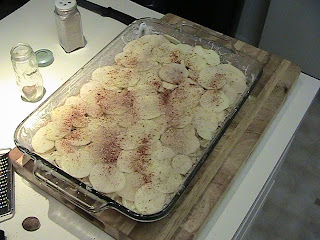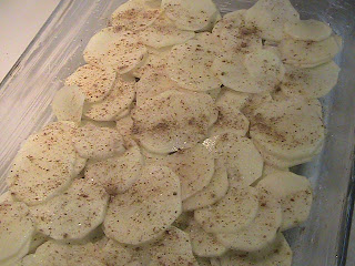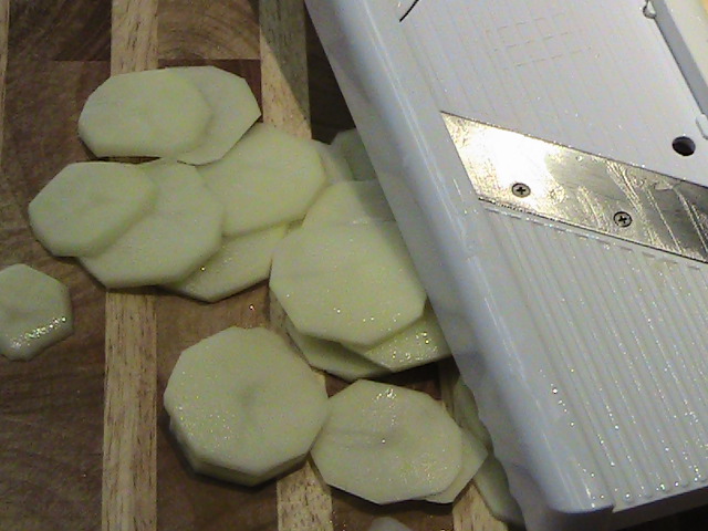 Slice the potatoes. If you have a mandolin, use 1/4 inch slice setting. If you cut the potatoes by hand, (it is possible, I have done it before I got a mandolin, it just takes longer) do your best to make each slice the same thickness of 1/4 inch.