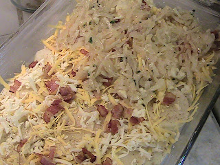 Layer half the cheese and half the onion and bacon mixture over the potatoes.