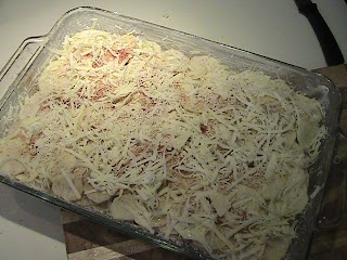 Now sprinkle the grated parmesan cheese on top of all this. Spray non-stick spray on the underside of a sheet of aluminum foil. Cover the baking dish with the aluminum foil, sprayed side down. Place in oven, close the door and turn the heat setting down to 350 degrees. Set the timer for 60 minutes. After 60 minutes, remove the aluminum foil and continue to bake until golden brown and bubbly, an additional 15-20 minutes. Remove from the oven and allow to sit for 10 minutes before serving. Try this and let me know how it turns out. I'd love to hear from you. Just leave a comment below. Enjoy!