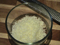 Now grate the cheese and add the moistened bread crumbs and eggs to the large bowl.