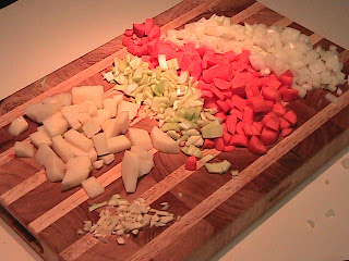 Start by cutting the onion, carrots, celery, potatoes and garlic.
