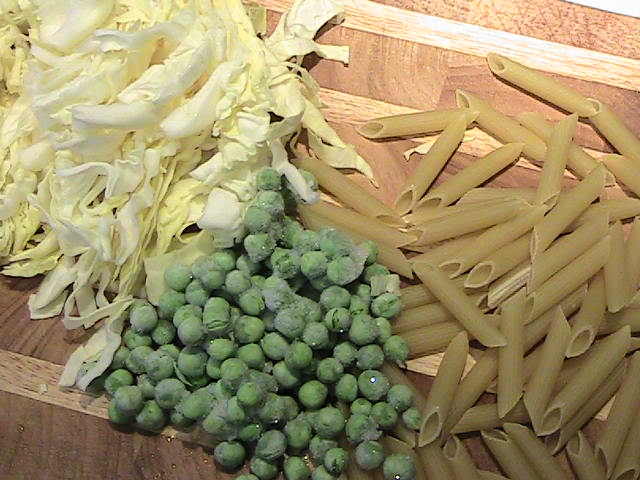 Now cut half a head of cabbage into thin slices. Measure 1 cup of pasta. Use any shape you have on hand. Break up spaghetti into 3 inch pieces if you have that. Measure 1 cup of frozen peas or green beans. Stir all that into the pot. It should be very full by now!