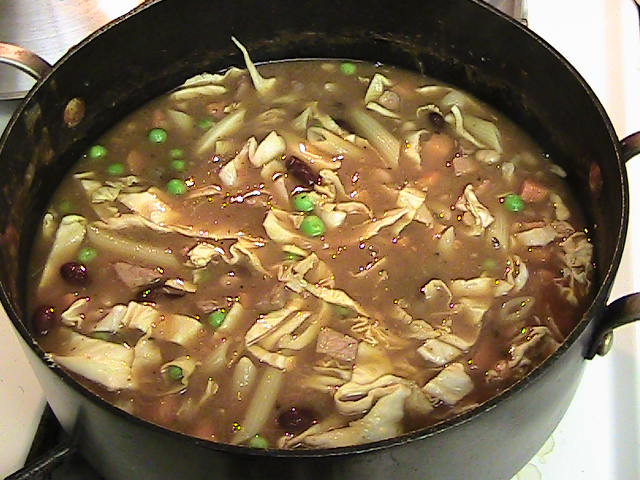 Use whatever leftover meat and vegetables you have in your kitchen. I used about a cup of chopped ham, some carrots, celery, potato, cabbage, beans, peas and onion.