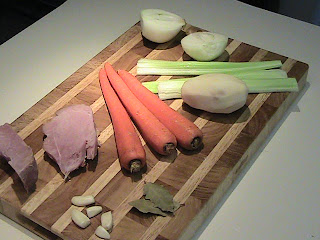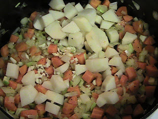 Heat a little oil in a large pot and saute the onions, celery and carrots over medium heat until soft, but not brown.