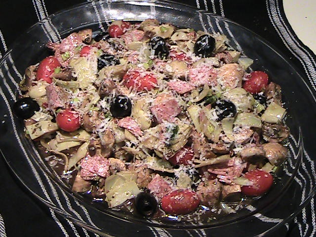 Clean the mushrooms; cut off the stems and cut each mushroom into quarters. Rinse off the tomatoes, open the can of olives and drain the liquid off. Pat dry the tomatoes and olives. Chop the onions, sun-dried tomatoes, banana peppers and salami. Remove the artichoke hearts from the jar and cut into smaller pieces (either in half or quarters depending on size).