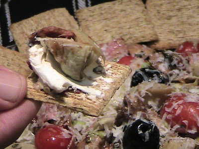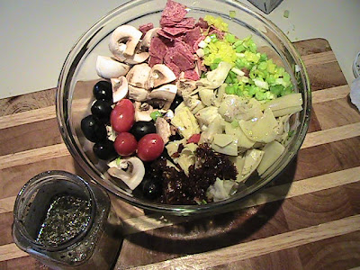 Clean the mushrooms; cut off the stems and cut each mushroom into quarters. Rinse off the tomatoes, open the can of olives and drain the liquid off. Pat dry the tomatoes and olives. Chop the onions, sun-dried tomatoes, banana peppers and salami. Remove the artichoke hearts from the jar and cut into smaller pieces (either in half or quarters depending on size).