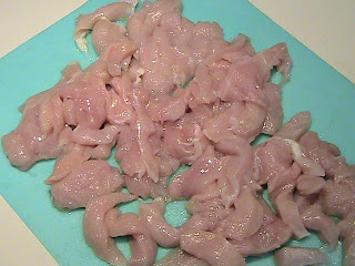 Prep chicken: wash and pat dry; trim any fat; cut across grain in 1/2 inch slices then across again in bite size pieces. Season with salt, pepper, cayenne pepper and cumin. Set aside.