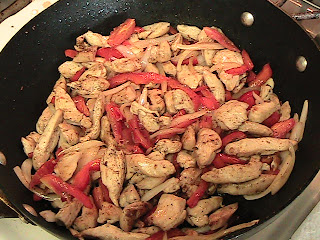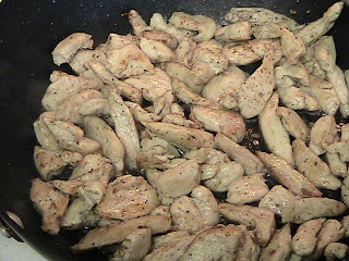 Heat 1 Tablespoon oil in large skillet. Use the largest pan you have. It needs to be wide and deep to hold all the ingredients without crowding. Heat on medium-high and throw the seasoned chicken into the hot oil and stir around.