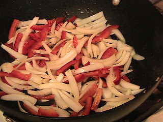 Heat pan to medium-high again and throw in the onions and peppers. Add more oil if necessary. Sprinkle with salt. Stir to prevent sticking and cook until the vegetables are softened a bit.