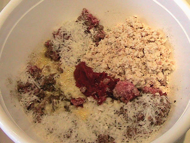 Add the eggs and Worchestershire sauce, tomato paste and lemon juice. Add the moistened bread crumbs.
