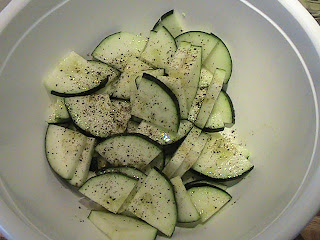 Cut the zucchini into 1/2 inch slices across the middle, then cut the rounds into four pieces. In a large bowl, season the zucchini with a little olive oil, salt and pepper. Mix thoroughly.